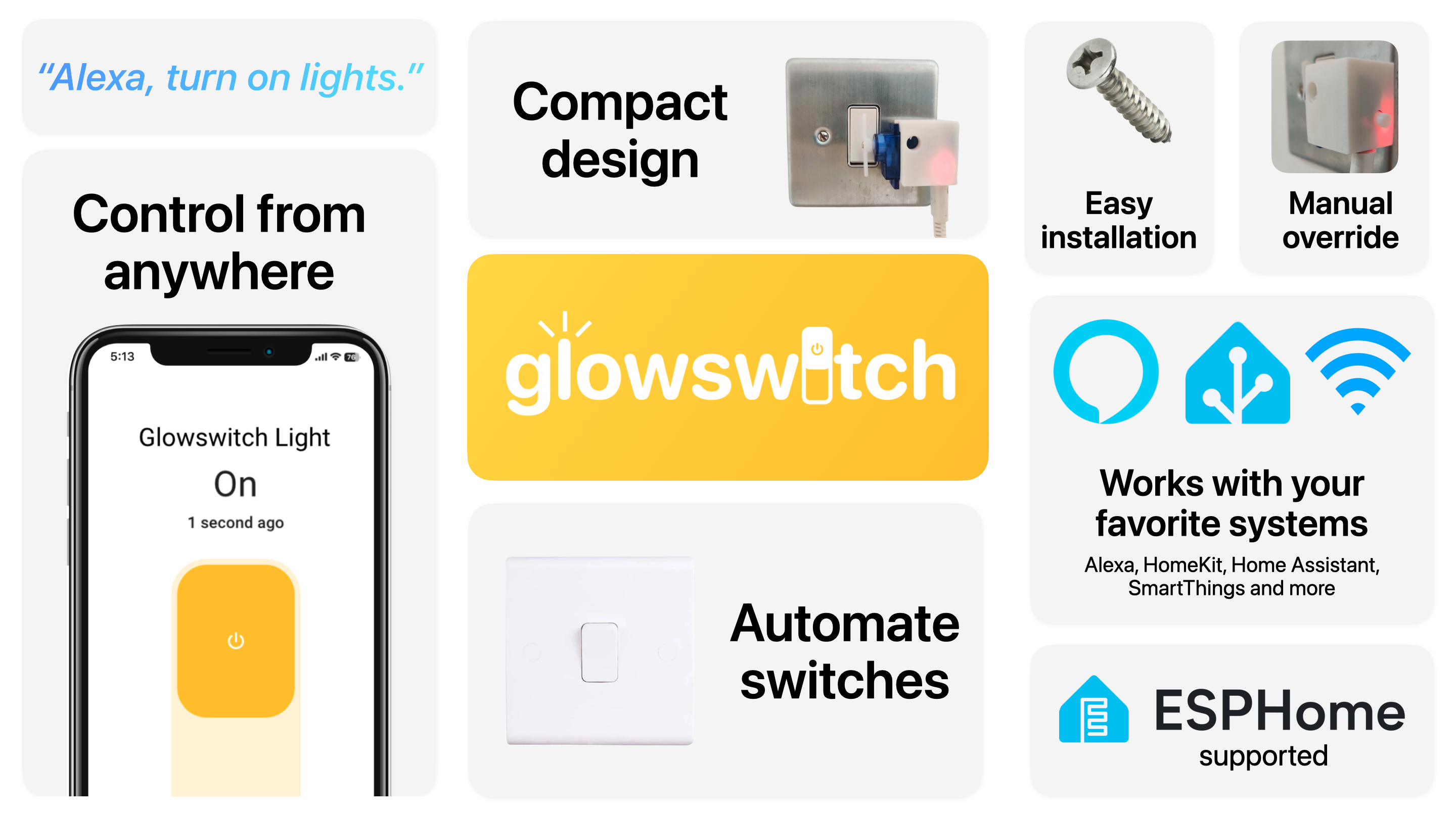 A glowswitch is a small device that screws onto your light switch, seamlessly automating it without messy electrical work or expensive smart bulbs.